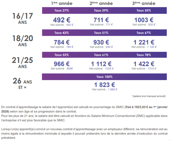La rémunération dans le cadre d’un contrat d’apprentissage varie en fonction de l’âge de l’apprenti et augmente chaque nouvelle année d’exécution du contrat (de 27 % à 100 % du SMIC)